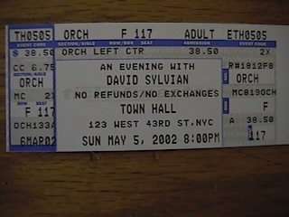 As would be expected, a very varied crowd turned out for David Sylvian’s long overdue return to New York. The band took to the stage at ten past eight, with Sylvian’s entrance met by a standing ovation from the audience. Attired in dark glasses, a caramel-brown leather jacket, dark brown trousers, and tan slip-on sneakers, Sylvian stood out from the rest of the band, dressed predominantly in black. Getting right down to business, the quintet opened with “The Scent Of Magnolia”, and breezed through three more songs before Sylvian spoke informing the crowd that an ongoing technical problem had been resolved. Sylvian appeared quite relaxed and smiled throughout the show, which I certainly wouldn’t have expected. He genuinely seemed to be enjoying himself, which I feel made the evening all the more special for the audience. The minimal band achieved a solid dynamic, offering mostly faithful renditions of Sylvian’s work, although with some subtle and often interesting interpretations from time to time. Colorful brass and string accents, present on studio recordings, were somewhat missed, but this hardly detracted from the overall sound. In particular, keyboardist Matt Cooper was truly a delight his spirited playing was most entertaining, often bordering on the unintentionally comedic. I thought Sylvian might even start laughing at one point during one of Cooper’s manic solos! Undoubtedly the highlight of the show for many was the guest appearance by longtime collaborator and friend, Ryuichi Sakamoto. Rumors that Sakamoto would be in attendance that evening had been circulating for weeks prior to the show, which probably inspired many fans to make the journey from far-off places for this particular performance. A lovely rendition of Sakamoto’s Zero Landmine tune segued smoothly into “Forbidden Colours”. As an added surprise, Sakamoto rejoined the band during their third encore an ‘impromptu version’ (according to Sylvian) of “Red Guitar”. While I certainly can’t argue with the songs chosen for the tour, I was disappointed that only one track from “Brilliant Trees” was included, and the brilliant “Gone To Earth” album was overlooked completely. Even so, I didn’t notice these omissions until I reviewed the set list after the show, thus reinforcing the success of the selections. Sylvian graciously acknowledged the audience for their appreciation and enthusiasm towards the end of the evening. I don’t recall ever attending a concert that didn’t include some sort of visual augmentation a set, lights, dancers, props, video screens, etc. That five musicians, stationary on stage for the most part, could mesmerize a crowd for two hours with sound alone is truly a credit to the quality of the music. It’s no wonder that Sylvian has achieved a status akin to deity with his admirers.